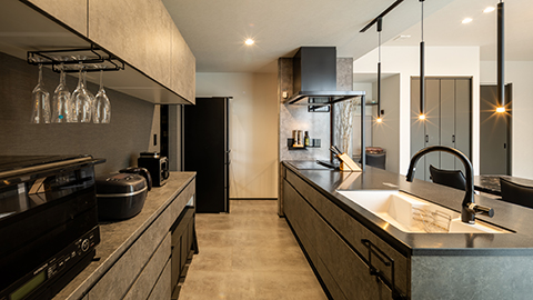 シンクとカップボードの間は作業性を重視し、2人が余裕ですれ違える幅を確保した。シンク前面は大容量の収納に、背面にはワイドなカップボードを設置して十分な収納を確保