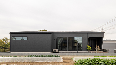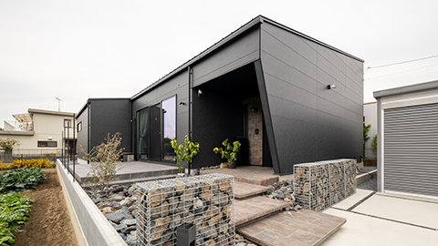 ワイドで個性的な佇まいは、平屋のスケール感を一層際立たせている