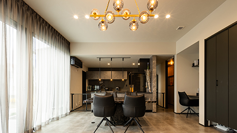 最も特徴的なのは、家全体を一周できるダイナミックな回遊動線。生活音を遮断できるように廊下を効果的に使ったプランは、利便性に加えてプライバシーを確保する配慮も行き届いています。天井高を50cm上げ、ハイドアと高いカーテンレールで開放感あるLDKになりました!