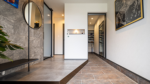 シャープなラインの框がモダンさを演出する玄関。三和土にはエクステリアと同じタイルを用いて繋がりをもたせた。機能的なベンチや夫婦が一目惚れしたミラーが空間をハイセンスに引き締める