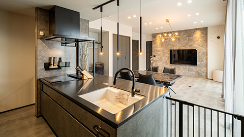 黒とグレーを基調としたシックなLDK。天井を通常より50cm高くして開放感を演出。タイルデッキにつながる大きな窓が、豊かな採光と外部空間との一体感を生み出す