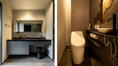洗面:シックな洗面台と間接照明が織りなすラグジュアリーな空間。椅子が収納できるほか、収納と一体化したデザインで機能美を追求