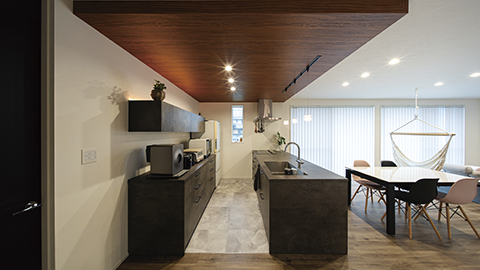 モルタル調のキッチンとウッド調の天井が調和。隣にはパントリーを備えた